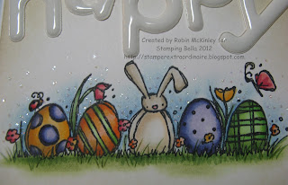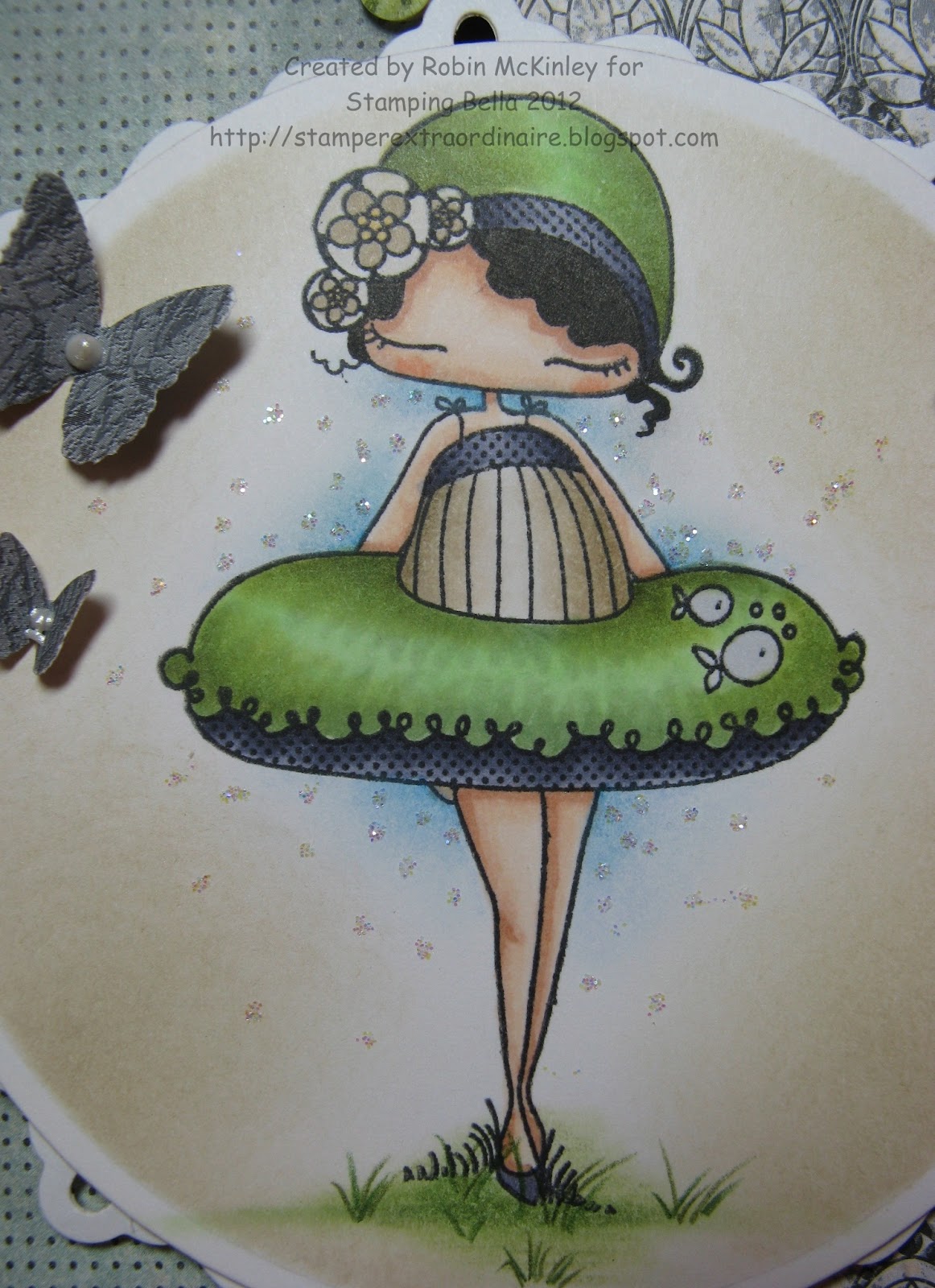 I stamped the lovely BridalPartyBellas on Bella's Bestest Paper using Memento Tuxedo Black ink. I coloured them mostly with Copics and added some shading with my Prismacolor Pencils. I cut them out with Label 4 Nesties and added some Wheat Versamagic sponging inside the stencil. I also added a bunch of glitter dots all around, and all over the bride's dress.